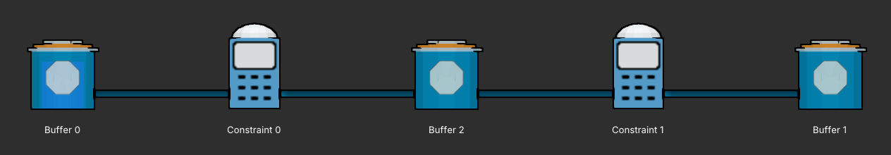 Each node represents a meaningful element of the real process. Buffers provide storage and allow material to accumulate, making them useful for modeling queues, inventory, and decoupling between steps. Constraints define rate limits and often represent machines or operations that control throughput. Conveyors and accumulating conveyors model transport and movement, while splits and merges describe branching and convergence in the flow. Conversions, assemblies, and batch nodes capture changes in material form or processing logic. Together, these nodes define both the physical layout and operational logic of the system.